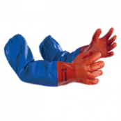 Длинные перчатки совмещенные с нарукавником для работы со скользскими поверхностями. Устойчивы к воздействию нефти, технических масел, растворов кислот (до 50%) и щелочей (до 20%).